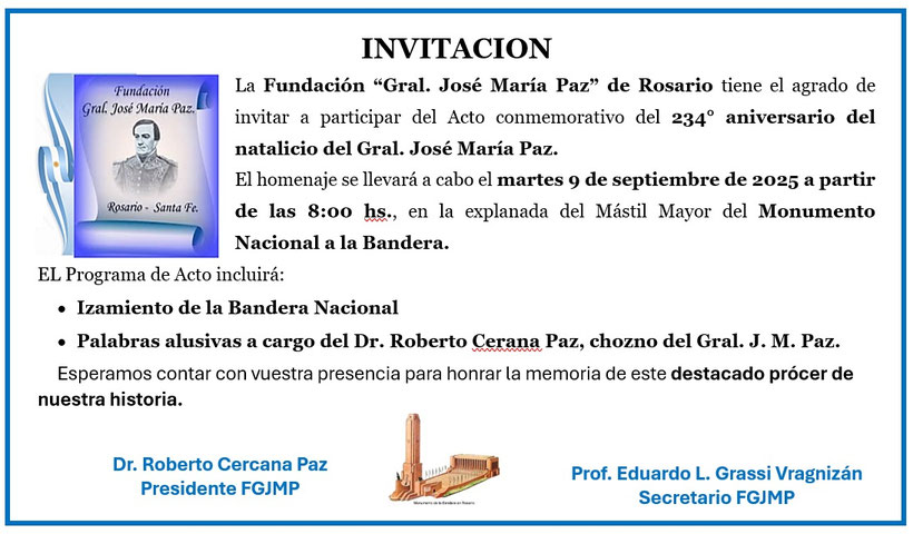 El General José María Paz nos legó más que victorias militares: nos dejó un ejemplo de coherencia, de integridad y de servicio. Honremos su memoria no solo con palabras, sino con hechos que dignifiquen nuestra vida pública y fortalezcan el porvenir de la República Argentina.